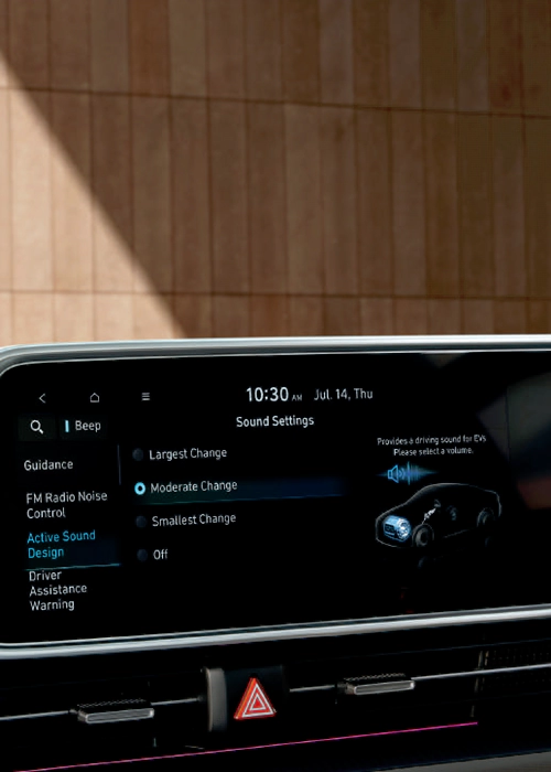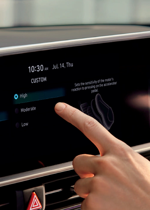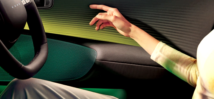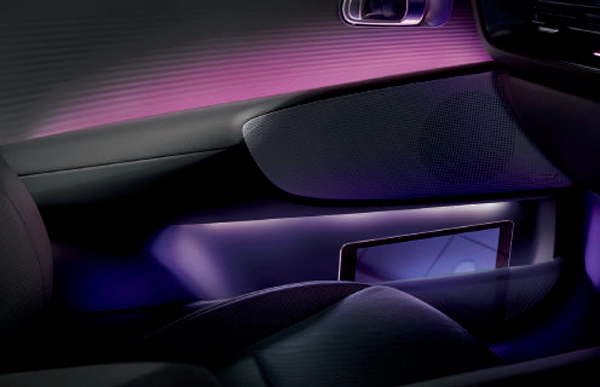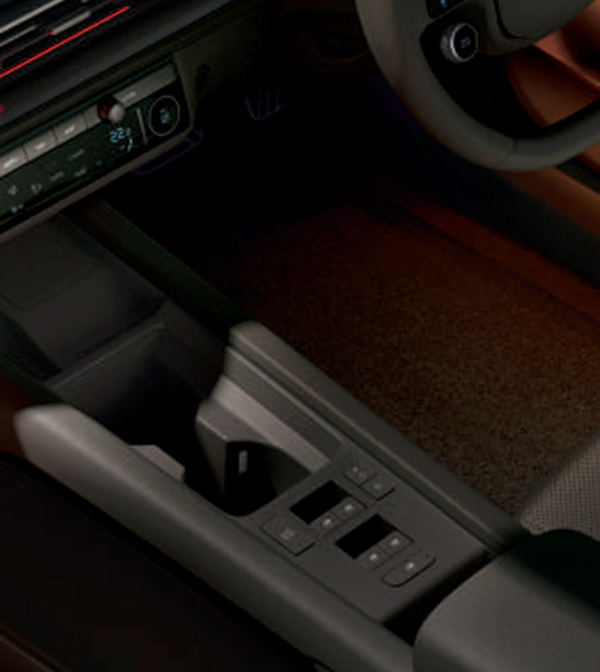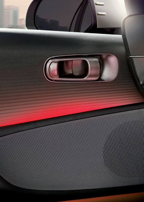 Tombol dari pintu depan dipindahkan ke konsol tengah untuk menyediakan lebih banyak ruang dan penyimpanan/dual color ambient yang dipasang di trim pintu atas dan bawah dapat dipilih dari 64 warna atau 6 tema warna ganda yang disesuaikan dengan suasana hati Anda.