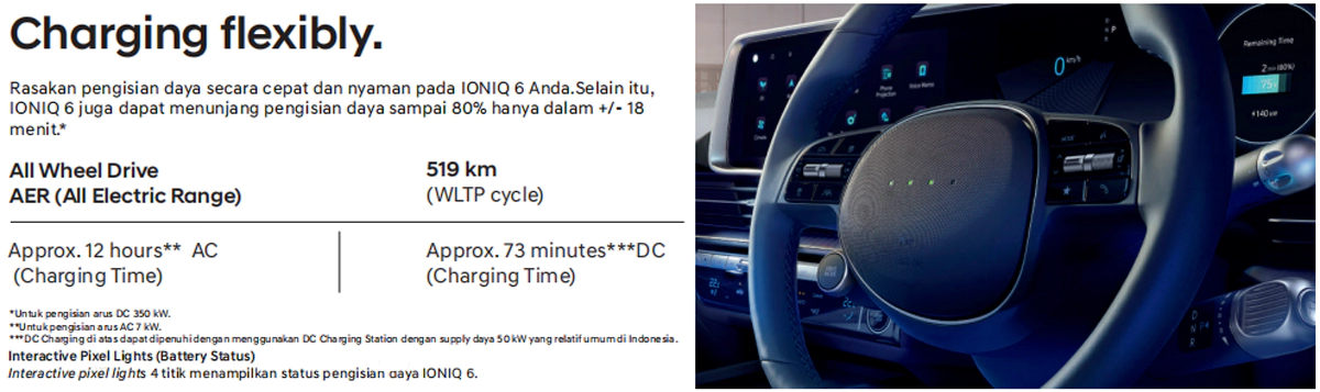 Dirancang untuk melengkapi kehidupan sehari-hari dengan memberikan ruang untuk membangkitkan potensi yang Anda punya. Melalui siluet aerodinamis, serta tampilan interior yang dirancang untuk memberikan kesenangan dalam berkendara. IONIQ 6 hadir untuk mewujudkan era baru mobilitas listrik.